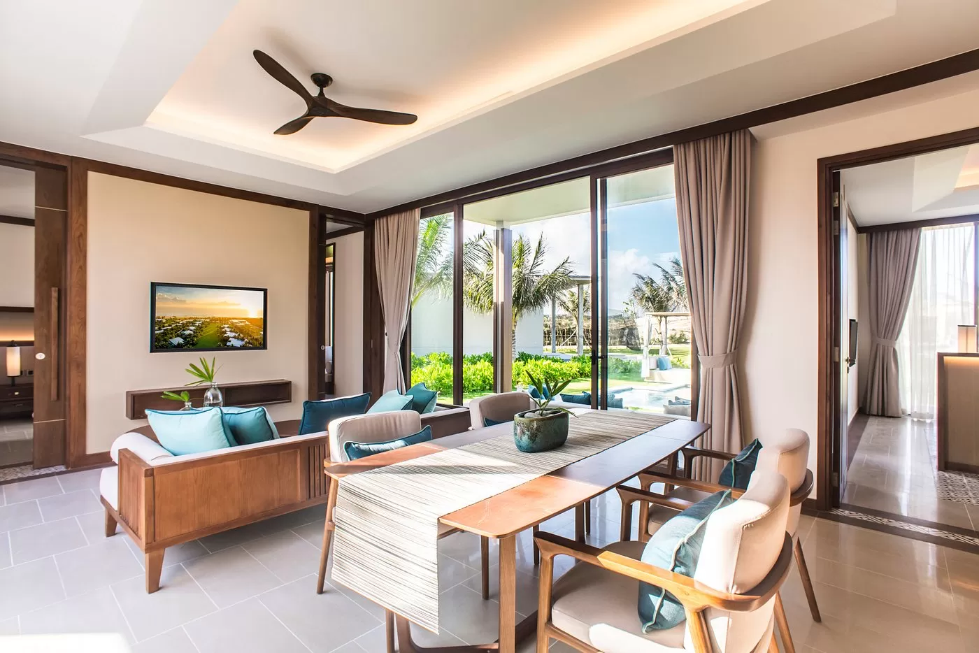 Avani Quy Nhon Resort, set on a private golden beach beneath soaring cliffs, offers a serene tropical retreat with modern rooms and suites in soothing mint, white, and aubergine tones, complemented by a relaxing spa experience.